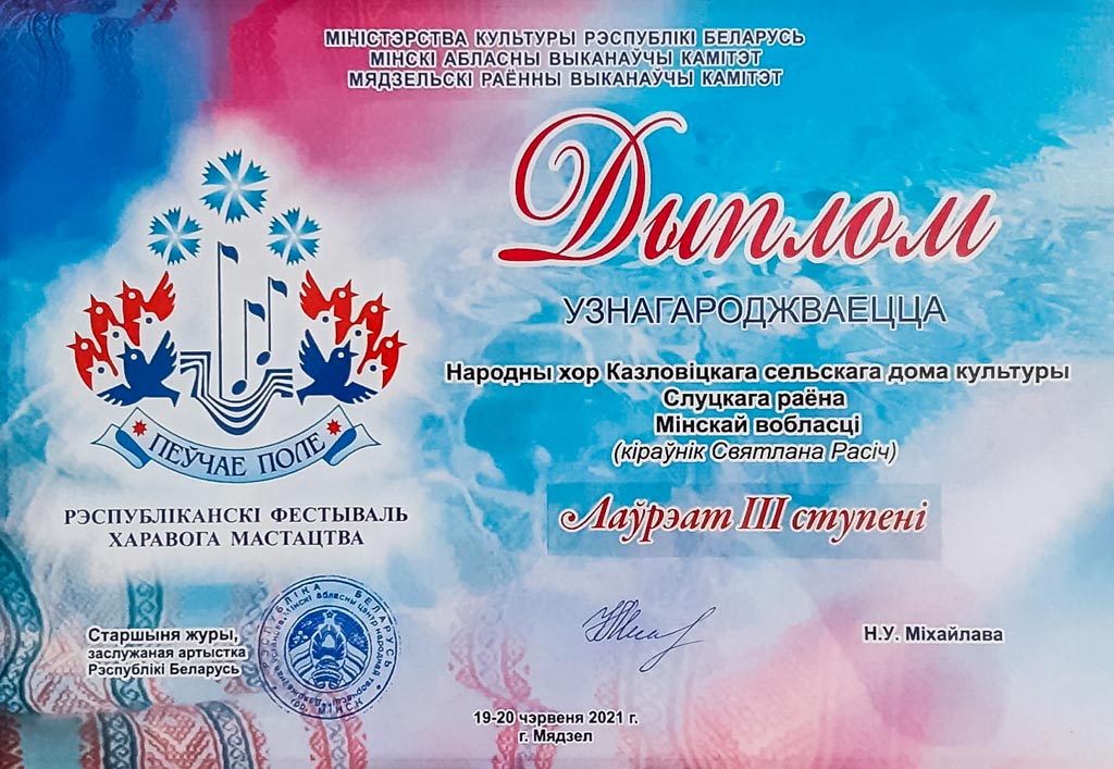 К слову, народный хор Козловичского сельского дома культуры (руководитель Светлана Расич) отмечен дипломом третьей степени. Поздравляем!
