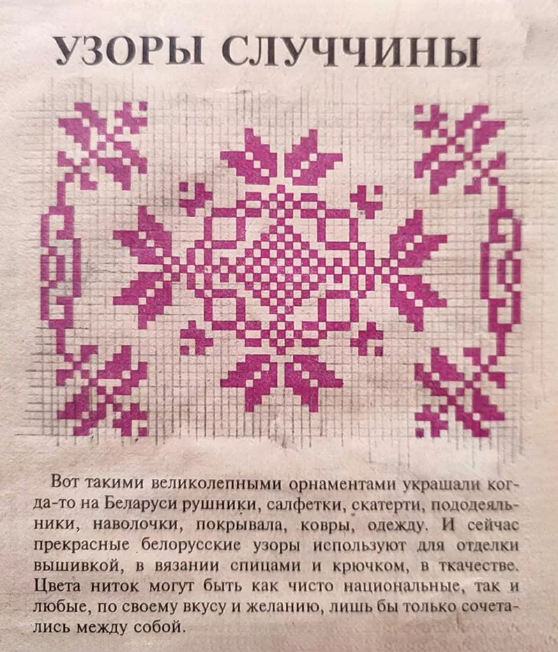 Среди множества страниц – вырезка из старого журнала «Работница и крестьянка» с заметкой «Узоры Случчины». На пожелтевшей бумаге – бордовый орнамент, строгий и нежный одновременно. Геометрия и цветы, как будто вышитые самой природой. Эти узоры когда-то украшали рушники, скатерти, покрывала, одежду случчан. Они были частью быта, частью праздника, частью памяти. И сегодня, благодаря таким людям, как Наталья, они не исчезают – они возвращаются.