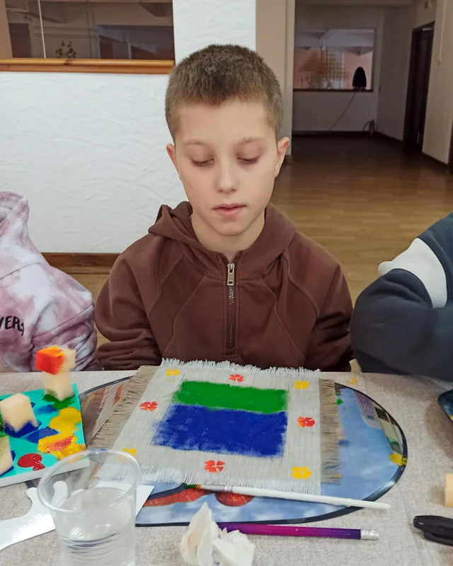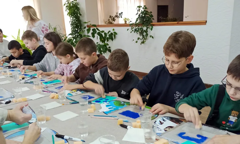 Именно этот язык дети пытались услышать и воспроизвести. Анастасия поэтапно объясняла технику нанесения красок – губками, кистями, через шаблоны и трафареты. Синий и зелёный фоны, как у настоящих маляванок, стали сценой для ярких узоров, придуманных самими участниками. Каждый ребёнок вложил в свою работу не просто краски, а частичку себя – свои мечты, настроение, взгляд на мир.